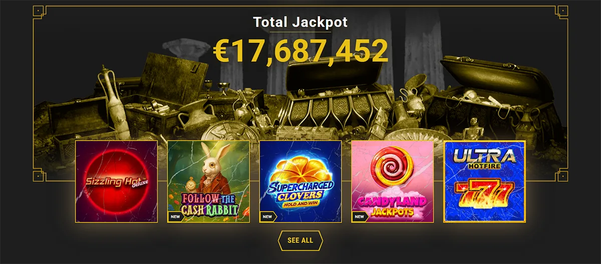 | Game Types | Slots, Table Games, Live Casino, Jackpots |